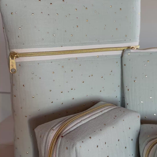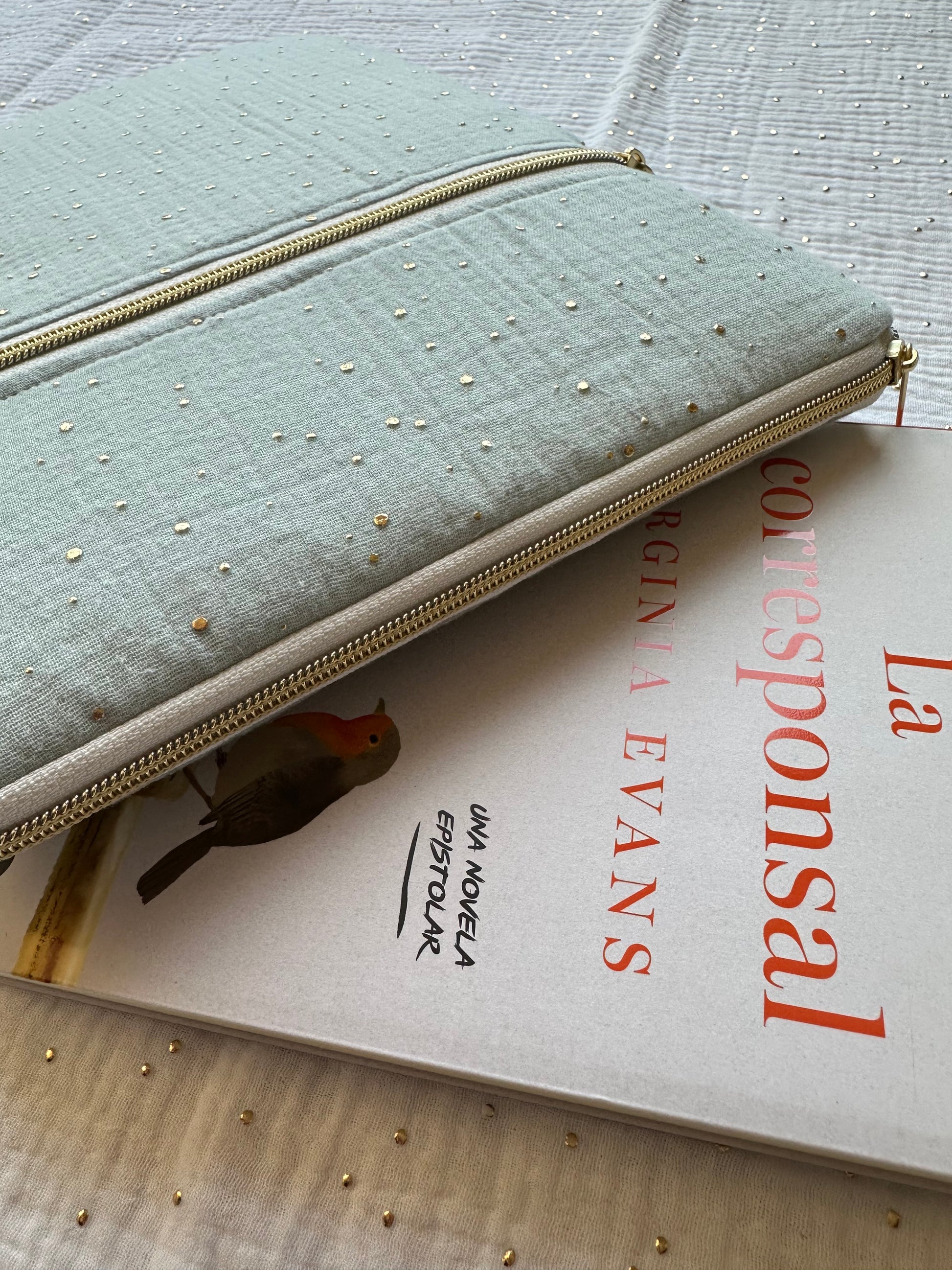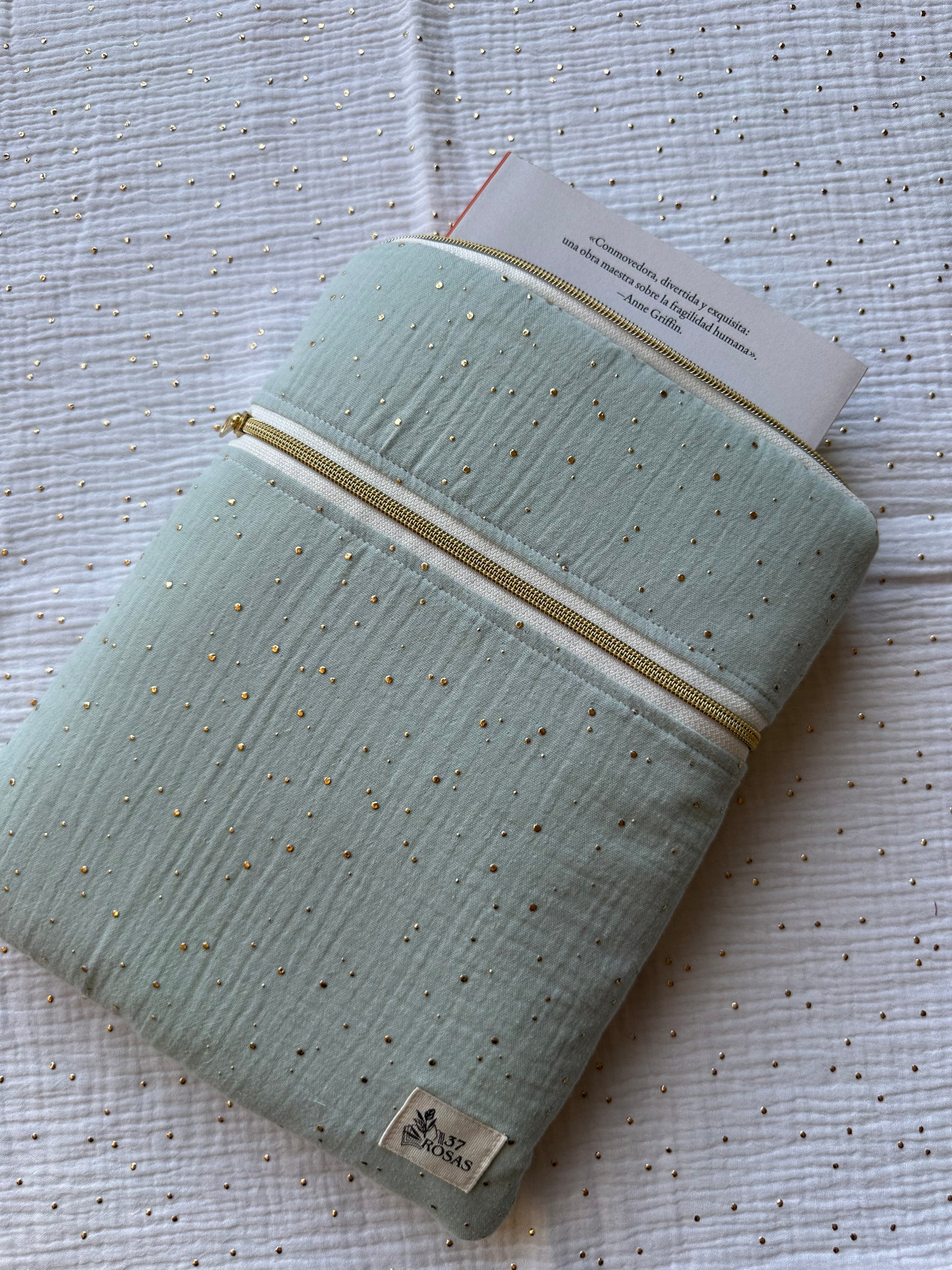 La funda de libro o tablet de la colección Aire es una pieza artesanal diseñada para quienes buscan protección, belleza y funcionalidad en un solo accesorio. Con unas medidas aproximadas de 23 × 28 cm, está confeccionada completamente a mano y destaca por su delicado acabado textil en muselina con discretos puntos dorados que aportan luz sin perder la esencia minimalista de 37 rosas.