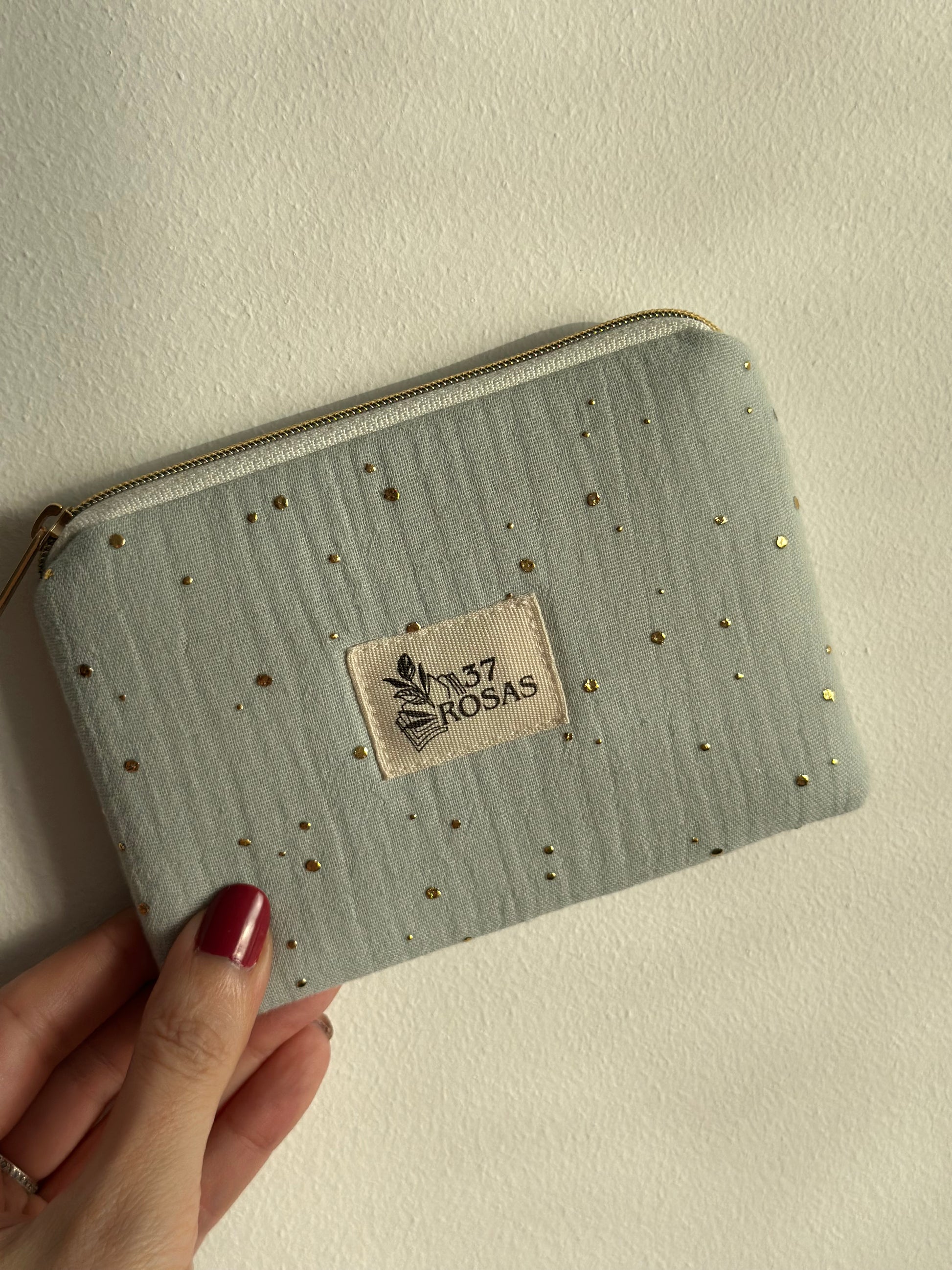 Su diseño limpio y atemporal destaca por una tela de muselina en color mint, salpicada de pequeños destellos dorados que aportan luz y un toque especial sin perder la esencia minimalista de la marca. La cremallera dorada garantiza un cierre seguro y añade un acabado elegante.
